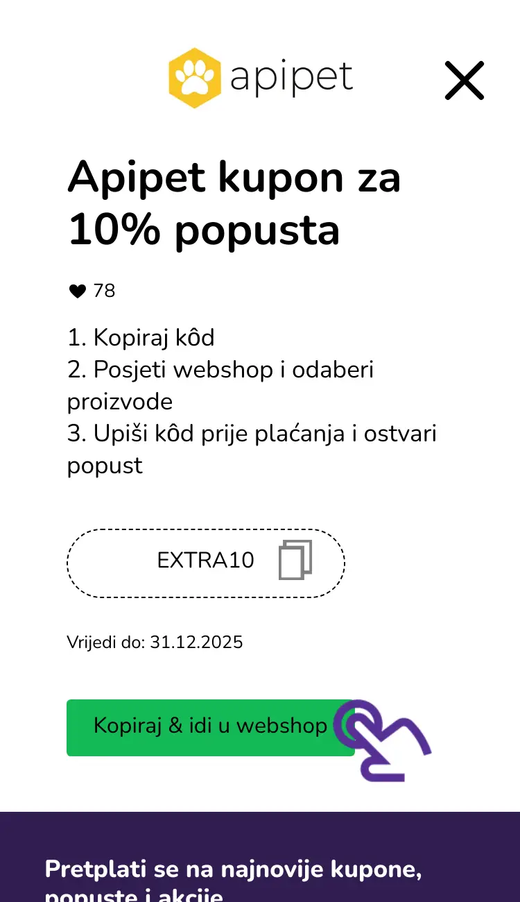 Apipet je hrvatski brend specijaliziran za prirodne dodatke prehrani za pse i mačke, s formulacijama na bazi propolisa koje pomažu kod probave, imuniteta, zdravlja dlake, zglobova i mnogih drugih problema. Zahvaljujući jedinstvenoj tehnologiji prerade propolisa bez kemikalija, Apipet proizvodi su sigurni, učinkoviti i namijenjeni svakodnevnoj brizi o zdravlju kućnih ljubimaca. Na našoj stranici možeš pronaći važeće Apipet kupone za popust koji ti omogućuju dodatnu uštedu prilikom online kupovine.