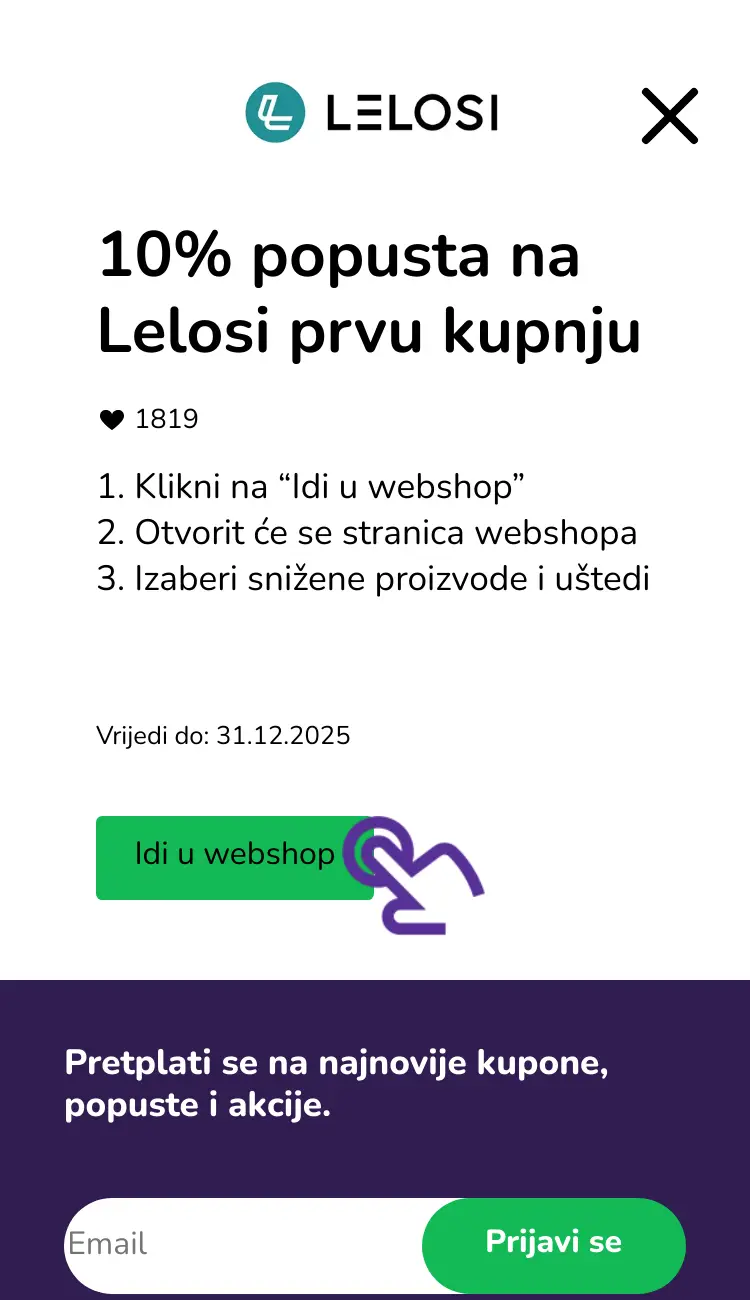 Na našoj stranici redovito objavljujemo važeće LELOSI kodove koje možeš koristiti potpuno besplatno. Samo odaberi kod iznad ovog teksta, kopiraj ga i unesi tijekom plaćanja na službenoj LELOSI stranici. Kodovi ti omogućuju dodatne popuste na razne kategorije proizvoda i redovito ih ažuriramo kako bi uvijek imao najbolje ponude pri ruci. Ako ti treba pomoć, pogledaj naš vodič za korištenje kupona.
